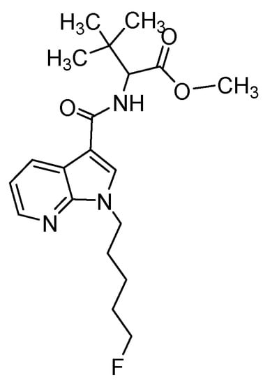 In this study, we present a new approach of employing various administration routes for drug exposure to ZF larvae to further improve metabolite identification resulting in a spectrum, which is widely in concordance with human metabolism. A new synthetic cannabinoid (SC), methyl 2-(1-(5-fluoropentyl)-1H-pyrrolo[2,3-b]pyridine-3-carboxamido)-3,3-dimethylbutanoate (7′N-5F-ADB, Figure 1), was chosen for this study because it appeared recently on the illicit drug market [27] as one of the most dangerous SCs with high potency and serious adverse effects resulting in hospitalizations and fatalities [28,29,30,31]. To characterize the circulation of 7′N-5F-ADB and its metabolites in the ZF larval body, the spatial distribution was visualized by matrix-assisted laser desorption/ionization (MALDI)-MSI as an emerging technique enabling the imaging of molecular species [32,33,34].