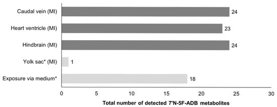 Comparison of the total number of metabolites produced depending on different administration routes in ZF larvae. Results for the samples investigated in this study are represented by the mean value of peak numbers of triplicates of 36 pooled larvae. (MI: microinjection, * these results were quoted from the previous study of 7′N-5F-ADB [24]).
