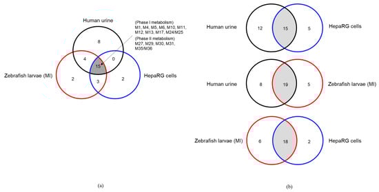 Comparison of the metabolites observed from the three models [human urine samples, zebrafish larvae (exposed via microinjection; MI), and HepaRG cells] using Venn diagrams. (a) Common metabolites detected among all models and (b) their mutual comparability.