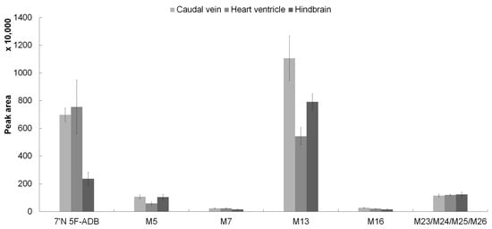 Detection profile of 7′N-5F-ADB and five major metabolites in microinjected ZF larvae (caudal vein, heart ventricle, and hindbrain). The most abundant metabolite, M13, was formed by defluorination in combination with oxidation of the formed primary alcohol (M7) to a carboxylic acid moiety. The clustered columns are displayed as mean ± SD (n = 3). The four structural isomers (M23, M24, M25, and M26) at m/z 410.2075 are represented as one metabolite due to co-elution from the LC-HRMS/MS system.