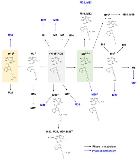 Overview of the reconstructed metabolic pathway of 7′N-5F-ADB based on the results from all investigated models. The progress of phase I metabolism is represented and the two major metabolites detected in all ZF larvae exposed to 7′N-5F-ADB, which were M5 and M13, are highlighted by a green and yellow box, respectively. Resulting phase II metabolites are displayed in blue. a Major metabolites in human samples; b major metabolites in microinjected ZF larvae; c major metabolites in HepaRG cells. A schematic representation of the reconstructed pathway from all three models can be found in Supplementary Figure S5.
