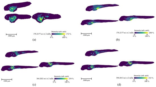 ZF larvae were exposed to 7′N-5F-ADB by different administration routes and the total number of metabolites observed in these microinjected samples was higher than the number of metabolites detected after conventional waterborne exposure (Table 1). The only exception was the ZF larvae sample, where the NPS was microinjected into yolk sac. Here, only one metabolite was found [24], which we could later explain by the compound’s lack of distribution in metabolically active organs of the larvae. Furthermore, the spatial distribution of 7′N-5F-ADB and its metabolites was investigated in detail by MSI and we found significant differences following aquatic exposure and microinjection into different organs (Figure 6 and Figure 7).