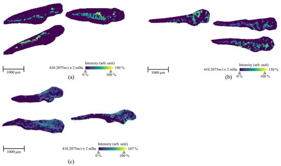 MALDI-MS images of the metabolite M23/M24/M25/M26 (four isomers, m/z 410.2075) in ZF larvae, which were exposed to 7′N-5F-ADB via microinjection into caudal vein (a), heart ventricle (b), and hindbrain (c) and then incubated at 28 °C for 1 h. These isomeric metabolites were the third most abundant in microinjected ZF larvae except ZF larvae treated through the yolk sac compartment. However, they cannot be differentiated in MSI due to lack of chromatographic separation. The presented sections originate from one representative larva per condition. The images were generated by preparing a colormap from blue (no detection) to yellow (high local concentration), and images were further processed by weak denoising in 96 dpi resolution with 24-bit color.