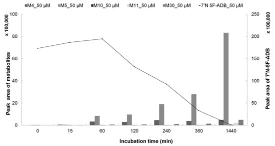 The concentration of 7′N-5F-ADB steadily increased up to 60 min and then declined significantly (Figure 8 and Supplementary Figure S2). Its metabolites had started to form markedly at this time point. Amounts of M5, M10, M11, and M30 were dramatically increased between 360 min and 1440 min, whereas M4 was increasing only slowly (Supplementary Figure S3).