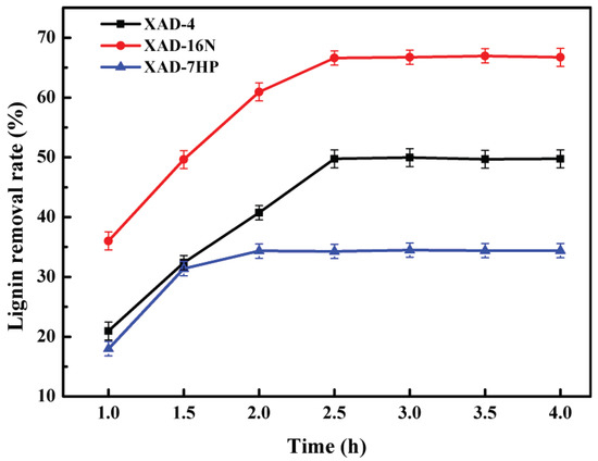 The effect of adsorption time of three different polymer resins on lignin removal is shown in Figure 1. It could be seen that the lignin removal rate of three different adsorbents increased rapidly with the adsorption time at first, then the rate of lignin adsorption became slower, and no further high delignification rate was found after the equilibrium was reached. The delignification capacity of XAD-4, XAD-16N and XAD-7HP resins increased with increasing contact time up to 2.5 h, 2.5 h and 2 h, respectively, and then it was nearly constant. The adsorption capacity of XAD-16N was better than that of XAD-4 and XAD-7HP and the maximum delignification rate of XAD-16N was 66.62%, which was 16.88% higher than XAD-4 and 32.29% higher than XAD-7HP, respectively.