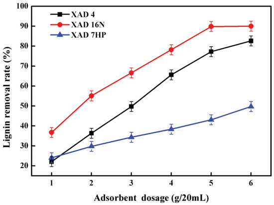 The effect of adsorbent dosage in the range of 1–6 g/20mL on lignin removal of three different adsorbents was investigated. As shown in Figure 2, the removal efficiency of lignin increased with an increase in the adsorbent dosage. Among these three kinds of resins, XAD-16N exhibited the best capacity of delignification, followed by XAD-4 and XAD-7HP. The rate of lignin removal after XAD-16N adsorption was 36.74% at the dosage of 1 g/20 mL, which increased rapidly and reached the maximum of 89.84% at 5 g/20 mL. The extent of lignin adsorption efficiency increased by increasing the XAD-4 and XAD-7HP resin amount. The delignification rate of XAD-4 was 22.10% at the dosage of 1 g/20 mL, which was 1.94% lower than XAD-7HP and increased to 82.63% at the dosage of 6 g/20 mL which was 32.90% higher than XAD-7HP.