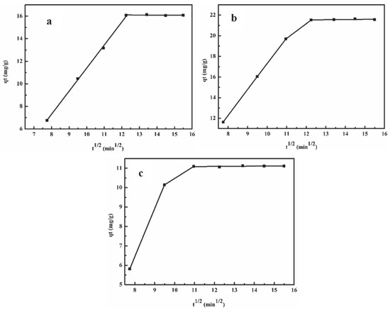 Intraparticle diffusion model. (a) XAD-4 resin adsorption; (b) XAD-16N resin adsorption; (c) XAD-7HP resin adsorption.
