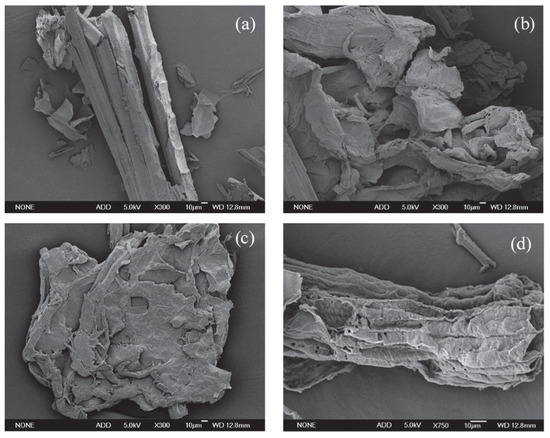 SEM images of straw after different treatments. (a) untreated; (b) NaOH combined with ozone (NaOH-ozone)-treated; (c) RBL at fourth cycle combined with ozone (RBL4-ozone)-treated; (d) XAD-16N adsorbed RBL at fourth cycle combined with ozone (ARBL4-ozone)-treated.