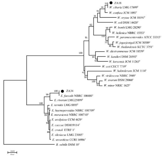Phylogenetic tree of ZA18 and ZA34. Bootstrap values for 1000 replicates are shown at the nodes of the tree and Bacillus subtilis is used as an outgroup. The bar indicates 1% sequence divergence. W. = Weissella, E. = Enterococcus, B. = Bacillus, Knuc = nucleotide substitution rate.