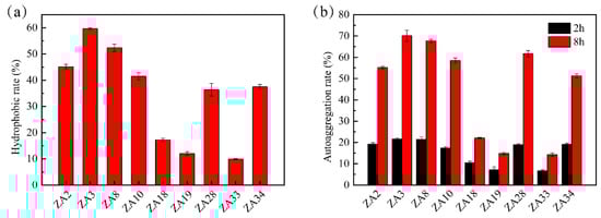 The hydrophobicity and auto-aggregation ability of nine selected LAB isolates are shown in Figure 4. Figure 4a exhibited strains had significant differences in hydrophobicity, among these nine strains, ZA3 had the highest hydrophobicity at 59.7%, and the lowest was ZA33, only 9.9%. The auto-aggregation ability of isolates was presented in Figure 4b; all tested isolates showed lower auto-aggregation ability at 2 h, while at 8 h increased significantly. ZA3 also showed the highest auto-aggregation at 78.95% in comparison to other LAB isolates tested. Thus, ZA2, ZA3, ZA8, ZA10, ZA28, and ZA34 were used for further testing.