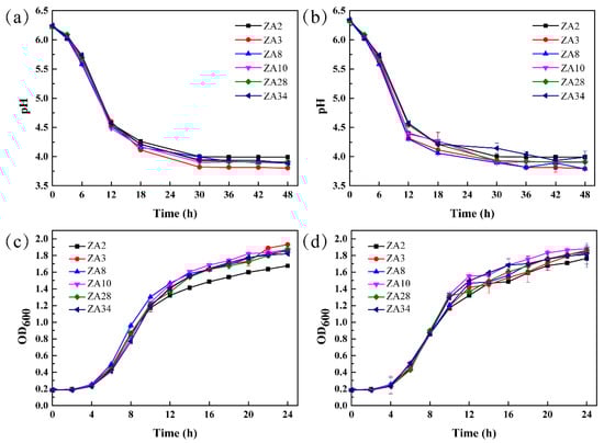 Acid production capacity and growth curve of six selected LAB isolates cultivated at 30 and 39 °C are shown in Figure 5. There was no significant difference in the acid-producing ability of ZA2, ZA3, ZA8, ZA10, ZA28, and ZA34 within 48 h, among which ZA3 had the lowest pH at 3.0 after 48 h fermentation (Figure 5a,b), moreover, strains showed stronger acid production ability under cultivated at 39 °C compared with 30 °C. Figure 5c and d show the growth curve of these six isolates in 24 h cultivate at 30 and 39 °C, respectively, and from which one could see that the growth adaptation period of all six strains was from 0 to 2 h, and the logarithmic growth period was from 2 to 16 h.
