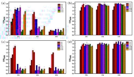 From Figure 6c, d, all six LAB isolates tested exhibited different viability after exposure to 0.5% bile salt and control for 2, 4, and 6 h. At 30 °C, only ZA2 and ZA3 had vitality with OD 0.896, and 1.481 after 2 h incubation, respectively, while other strains had no activity. After 4 h incubation, all strains were almost inactive (OD value of ZA2 was 0.474) except ZA3, which still had 1.341 OD value; for 6 h, the OD value of ZA3 was also 1.115. Regarding 39 °C, only ZA2 and ZA3 had vitality with OD 1.096 and 1.583 after 2 h incubation, while other strains had no activity; after 4 h incubation, only ZA3 had 1.219 OD value; after 6 h treatment, the OD value of ZA3 was also 1.210.