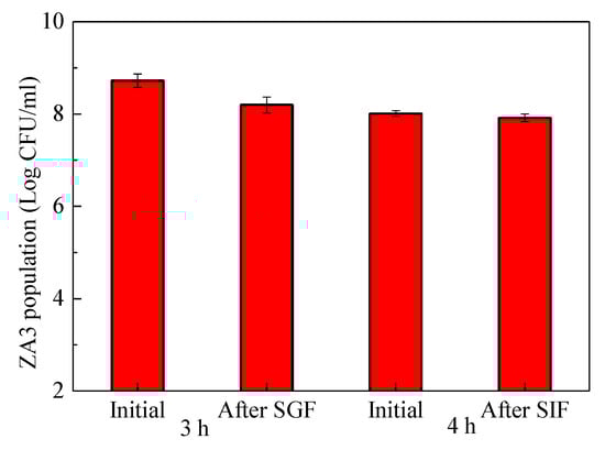 Figure 7 illustrates the viable count (log colony forming units, CFU/mL) of the strain ZA3 during GI exposure. The population of ZA3 before in simulated gastric fluid (SGF) was 8.72 log CFU/mL, while after 3 h incubation in SGF, the population of ZA3 was 8.20 log CFU/mL, and the survival ratio was 94.03%. As for simulated intestinal fluid (SIF), an initial population of ZA3 was 8.01 log CFU/mL, the population reduced to 7.92 log CFU/mL after 4 h treatment, which was, to say, the survival ratio of ZA3 after the SIF phase was 98.88%.