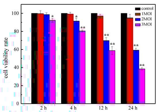 Cell Counting Kit-8 (CCK-8) results are shown in Figure 9. When treated with 1 multiplicity of infection (MOI ZA3), the cells showed normal activity at all time periods, which was not significant compared to the control (p > 0.05). As for 2 MOI ZA3, after 2 h reaction, cell viability was slightly reduced, and it did not damage cells or affect cell viability after 4 h reaction. Regarding being treated with 3 MOI ZA3, cells were severely damaged, and the survival rate was significantly reduced compared with control cells (p < 0.05). After 4 h reaction, the cell survival rate was significantly reduced (p < 0.01). Moreover, cell survival rate was significantly reduced, and cells were severely damaged (p < 0.01) after being treated with 2 and 3 MOI for 12 and 24 h.