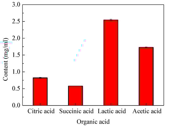Liquid chromatography was used to analyze the acid production of ZA3 after 24 h fermentation. As shown in Figure 10, four kinds of organic acid were mainly detected in the fermentation broth: citric acid, succinic acid, lactic acid, and acetic acid. The content was 0.822, 0.576, 2.545, and 1.729 mg/mL, respectively.