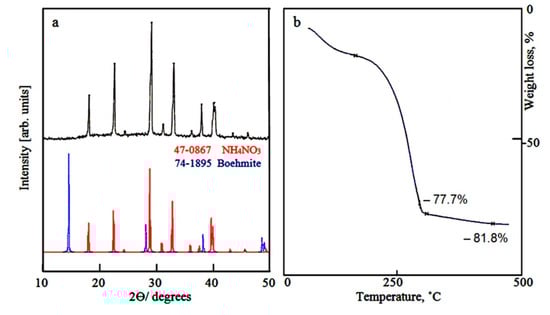 The thermal gravimetric analysis (TGA) of the dried gel was shown in Figure 1b. The TG curve showed that weight loss of about 77.7 wt.% was observed at 300 °C. It means that the ratio between aluminium nitrate and aluminum hydroxide is 3:1 agreeing with the Equation (1).