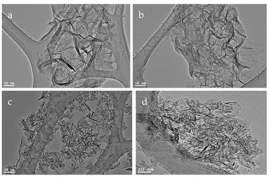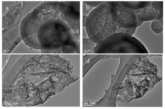 TEM images of the nanocomposite NC-1: (a,b) before thermal treatment and (c,d) after thermal treatment.
