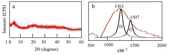 By increasing the ratio of carbon source to solid fuel, the third nanocomposite NC-3 was produced through reducing the amount of solid fuel. X-ray diffraction of NC-3 is displayed in Figure 7a. It is similar to that of the second nanocomposite indicating amorphous structure. Raman spectrum of NC-3 showed the characteristic peaks of graphitic materials. Figure 7b revealed the D and G bands at 1361 cm−1 and 1507 cm−1, respectively. The broad band at the interval 700 cm−1–2000 cm−1 confirmed presence of amorphous carbon in addition to aluminium oxide nanoparticles. The similarity of X-ray patterns and Raman spectra between both the second and the third nanocomposites indicated that both of them have the same structure.
