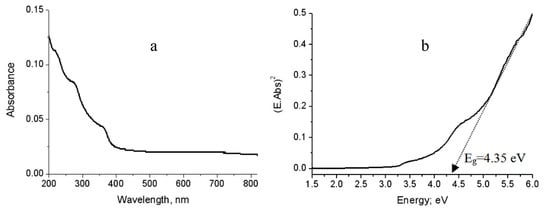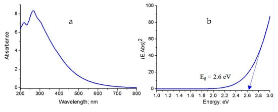 These observations were also noticed in the third nanocomposite NC-3 as shown in Figure 11. Figure 11a showed a broad absorbance of NC-3 in the wavelength range 200–1100 nm. It means that the third nanocomposite became optically active in the visible region. The band gap energy of NC-3 was 1.6 eV as shown in Figure 11b.