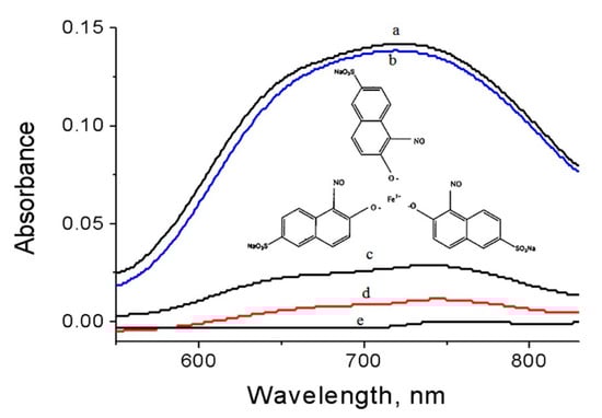 Absorbance spectra of naphthol green B after10 min in sunlight (a) No sample, and in presence of (b) alumina nanoparticles, (c) NC-1, (d) NC-2, and (e) NC-3.