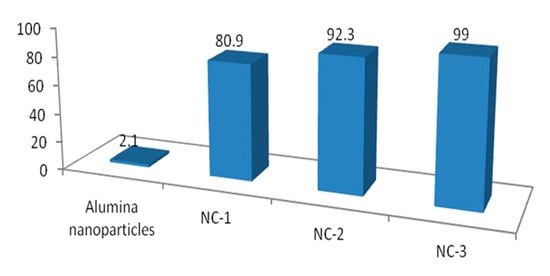 A green mixture with one of the prepared materials was illuminated for ten minutes in sunlight. After that the concentration of the green dyes was determined through measuring the absorbance of the green solution. These results are displayed in Figure 13 and Figure 14. The percentage of naphthol green B in presence of NC-1 sharply decreased after illuminating 10 min in sunlight as shown in Figure 13. Figure 14 showed 80.9% removal of the green pollutant. In case of using NC-2, the removal increased to be 92.3% in the same period, while complete decolorization and removal of the green dyes were nearly achieved after using NC-3. Figure 13 showed approximately complete disappearance for the absorbance of the green dyes. Additionally, Figure 14 revealed that 99% of the green dyes was removed by NC-3 after irradiating 10 min in sunlight. In case of using the nanoparticles of alumina in sunlight, slight variation was noticed for the intensity of the absorbance of the green dyes after 10 min as shown in Figure 13. Additionally, Figure 14 showed low removal for the green dyes 2.1%. It means that the prepared nanoparticles of alumina are ineffective in sunlight. The comparison between the results of alumina nanoparticles and their nanocomposites indicated that the explosive technique is very effective for converting non-optical alumina to optical nanomaterials. By comparing with our previous results of zinc oxide nanoparticles, the prepared nanocomposites were more effective in sunlight than the most familiar optical materials because the Al doped ZnO nanoparticles caused reduction for the band gap energy from 3.29 to 3.23 eV leading to complete removal of NGB in 6 h under sunlight [21]. Recently, the complete decolorization and decomposition of green dye were achieved after 1.25–1.3 h of irradiation of UV light using the aluminium zinc oxide nanocomposite-coated CNTs and nanofibers [21,22].