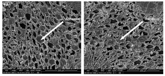 The microscopic morphology of the bamboo scrimber before and after treatment is shown in Figure 1. Although the bamboo parenchyma cells became more distorted after the hot oil treatment, the cell wall was not significantly damaged. The glue layer was able to be clearly observed, and the glue existed in the cell cavity, indicating that the hot oil treatment does not damage the cell wall structure of bamboo parenchyma cells and has little effect on the glue layer. This suggests that oil treatment has no obvious negative influence on the bonding properties of bamboo scrimber [14,15].