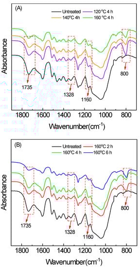The FTIR spectra of the untreated and treated samples are presented in Figure 2. The differences in the spectra of the untreated and treated samples at different treatment conditions were evaluated to understand the structural changes that occur within the polymeric structure of the bamboo during hot oil treatment. The shape of infrared spectrum did not change obviously after treatment, indicating that the bamboo scrimber did not undergo drastic chemical changes after treatment. A new band at 800 cm−1 found in the treated samples confirmed the presence of stretching vibration Si-C in Si-CH3 of methyl silicone oil [16]. There was a peak at 1736 cm−1 due to absorption of the carbonyl group, in which the intensity decreased. Absorption decreased significantly at the treatment condition of 160 °C and 6 h resulting from the degradation of hemicellulose under that condition. The absorption peak at 1159 cm−1 (C-O-C stretching vibration) and 1318 cm−1 (O-H stretching vibration) also decreased, confirming that the hemicellulose was dramatically degraded [17]. Lignin and phenolic resins are more difficult to decompose at lower temperatures [18]. Further cross-linking of phenolic resin can take place in the bamboo scrimber [19].