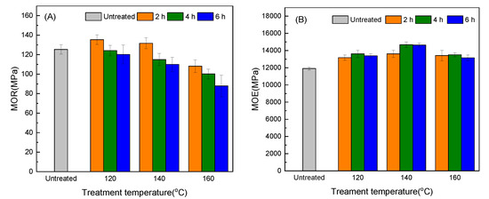 The influence of hot oil treatment on the modulus of rupture (MOR) of the bamboo scrimber is shown in Figure 4A. Temperature and time had a significant impact on the MOR according to the results (<0.05) of p-test. The MOR gradually decreased with the extension of the treatment time and the increase of the treatment temperature. At 120 °C and 140 °C for 2 h, the MOR increased by 8.00% and 5.08%, respectively, due to the decrease of air-dried moisture content [22]. However, the MOR decreased as the treatment time increased because of the degradation of hemicellulose, but the change was not obvious as compared to the control. The treatment time is extended mainly to extend the time of the internal reaction of the molecule and store more intermolecular activation energy [23], causing the hemicellulose to continue to degrade. When the temperature was 160 °C and the treatment time was 2 h and 4 h, the MOR decreased for the continuous degradation of hemicellulose. When the treatment time was 6 h, the MOR decreased by 29.90% due to the massive degradation of hemicellulose.