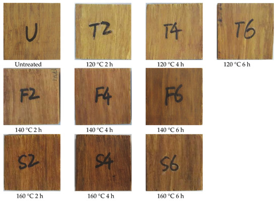 Digital photographs of the bamboo scrimber after hot oil treatment are shown in Figure 5. The color of untreated bamboo scrimber was dark yellow and became darker after treatment. As the treatment temperature and time increased, the color changed to brown. The color of bamboo scrimber after treatment is darker than that of untreated group [24].