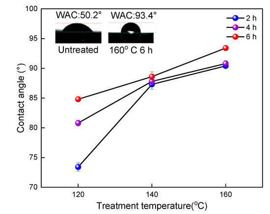 The contact angle of each group of samples is shown in Figure 6. The contact angle is the most intuitive parameter that indicates the surface wettability of the bamboo scrimber timber. Larger contact angle means less wettability and shows the greater hydrophobicity of the bamboo scrimber [26]. The contact angle of the untreated group was 50.2°, and that of the 160 °C and 6 h treatment group was 93.4°. It can be seen that as the temperature of oil increases, the contact angle of bamboo scrimber tends to increase and the influence of temperature on the contact angle is significantly greater than the influence of time. The increase in the contact angle of the bamboo scrimber was due to the dehydration of the hydrogen bonds of the cellulose into ether and hemicellulose pyrolysis after treatment, which reduced the hydrophilicity of the bamboo scrimber [27,28]. Moreover, the formation of oil film on the surface of the bamboo scrimber also has a great influence on hydrophobicity.