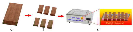 Schematic diagram of hot oil treatment. (A) Bamboo scrimber. (B) Saw cutting. (C) Hot oil treatment.