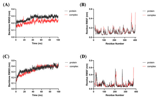 Similar RMSF distributions were observed for the IDO1 and HDAC1 in apo/bounding forms, respectively (Figure 4B,D). The greatest fluctuations observed in the terminals of IDO1/HDAC1 and regions (residues 203–212 and 265–274) of HDAC1. Residues in Pocket A and Pocket B of IDO1, including Tyr126, Phe163, Phe164, Phe226, Arg231, Gly262 and Ala264, were quite stable. Residues in active sites of HDAC1, such as His140, His141 and Tyr303, were stable too. Overall, the RMSF analysis indicated that the complex and protein exhibited similar dynamics during the MD simulations.