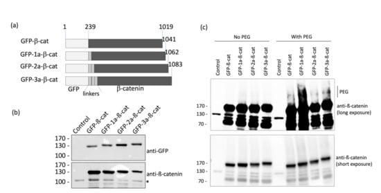 The experimental procedure we followed was previously described by Leturcq et al. 2018 [34]. Briefly, HeLa cells were transfected with the different GFP-β-catenin constructs (Figure 2a) and treated with 200 µM of Ac4GalNAz for 24 h. Then, 50 µg of the labeled proteins were resuspended in 20 mM HEPES and 1% (w/v) SDS, pH 7.9, and incubated for 1 h at room temperature with a 4.4 kDa DBCO-PEG (polyethylene glycol) at a final concentration of 10 mM in DMSO. DBCO-PEG was synthesized, as previously described [35]. One volume of PEGylated proteins was precipitated using the mix of chloroform:methanol:water (3:0.75:2) in order to remove the excess of DBCO-PEG. Proteins were heated at 95 °C for 10 min, resolved by SDS-PAGE, and analyzed by Western blot.