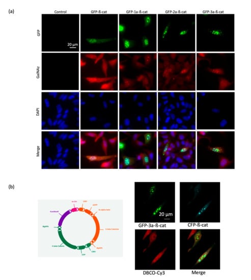 Evaluation of the GFP-β-catenin constructs via fluorescent microscopy. (a) Fluorescence images of HeLa cells expressing GFP-linker-β-catenins, treated with 200 µM Ac4GalNAz and labeled with DBCO-cy3. (b) Fluorescence images of HeLa cells expressing GFP-3a-β-catenin and CFP-β-catenin, treated with 200 µM Ac4GalNAz and labeled with 10 µM DBCO-cy3. The map of the vector encoding both the GFP-3a-β-catenin and the CFP-β-catenin is shown on the left. CFP, cyan fluorescent protein.