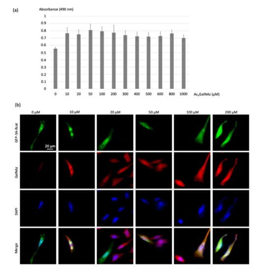 Optimization of the concentration of the chemical reporter. (a) The histogram represents the cytotoxicity evaluation of the chemical reporter Ac4GalNAz; Hela cells were treated at a concentration of 0 to 1000 µM. Twenty-four hours later, the cell viability was determined using the MTS assay. (b) HeLa cells transfected with the GFP-3a-β-catenin expressing vectors were treated with increasing Ac4GalNAz concentration (10, 20, 50, 100, and 200 µM) and labeled with DBCO-cy3 (10 µM).