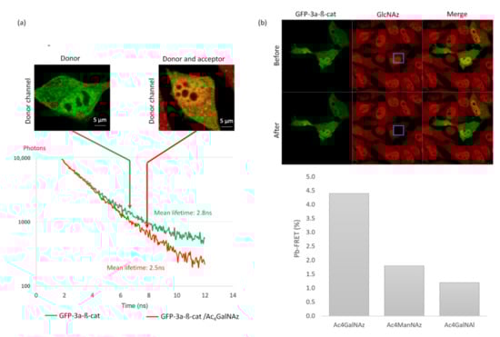 To carry out a quantitative analysis of the FRET between the GFP and the cy3-labeled GlcNAc, a spectral fluorescence lifetime imaging microscopy (SLiM) acquisition system was used, thus acquiring, simultaneously, 16 photon decay curves along the fluorescence emission spectrum, and permitting unambiguous FRET measurements (Figure 5) [24]. In the absence of the chemical reporter, a mean fluorescence lifetime of 2.8 +/− 0.06 ns was observed in GFP-3a-β-catenin expressing cells (Figure 5a). We then imaged GFP-3a-β-catenin expressing cells that were treated with Ac4GalNAz and click-labeled with DBCO-cy3. Using these conditions, the mean fluorescence lifetime of the GFP reporter in Ac4GalNAz-treated cells decreased to 2.5 +/− 0.17 ns, which indicated that some of the GFP energy was transferred to the nearby cy3 fluorophore (Figure 5a). A FRET event could thus be observed with a p-value < 0.05.