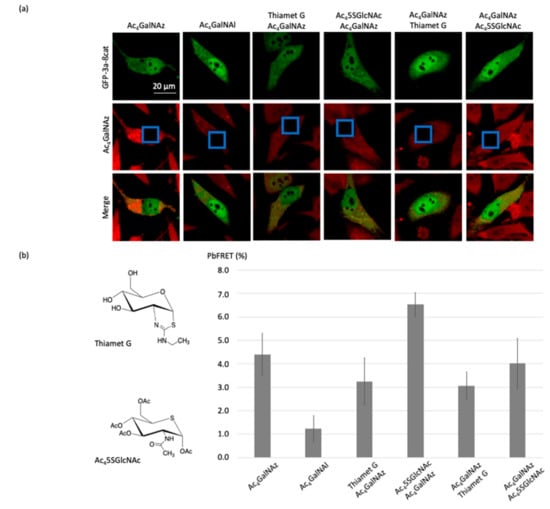 Conversely, when GFP-3a-β-catenin-transfected HeLa cells were incubated with 100 µM Ac45SGlcNAc for 2 h prior to the treatment with Ac4GalNAz and labeled with DBCO-cy3, a large increase (2.1%; see Figure 6) of the pb-FRET signal was recorded compared to the untreated cells. This observation was consistent with previous studies [16,29] that showed a major reduction in cellular O-GlcNAc when using this inhibitor. Indeed, the expression of OGT increased in response to its inhibition [30,31,32]. Thus, the blockade of its activity by UDP-5SGlcNAc resulted, as expected, in higher OGT expression, as previously demonstrated and also seen with the OGT inhibitor OSMI-1 [30] or upon glucose deprivation [31,32]. It should also be noted here that the substrate was present in an excess amount, compared to the inhibitor in our step-up, as Ac4GalNAz concentration was higher than Ac45SGlcNAc concentration, and effective inhibition nevertheless still occurred. On the other hand, adding the OGT inhibitor after treating the cells with Ac4GalNAz had no effect, with the same pb-FRET signal being recorded as that of the control cells incubated only with the azido-sugar. The absence of an increase in signal was most likely due to the fact that the incubation time with the inhibitor was too short to observe an increase in the expression of OGT, as we assumed for the previous condition.