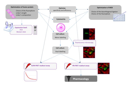 Flowchart demonstrating how to combine the technologies for FRET-based imaging of dual-labeling of glycoproteins.