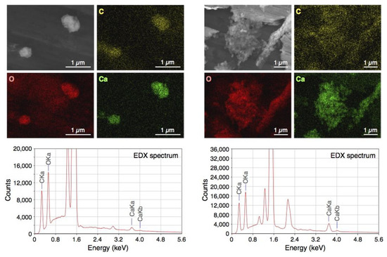 Scanning Electron Microscopy (SEM) and energy dispersive X-ray (EDX) elemental mapping images and EDX spectra of freeze-dried bioshell calcium oxide (BiSCaO) Water. Two different regions of the sample were analyzed (left and right). Yellow, red, and green pictures show the presence of carbon, oxygen, and calcium, respectively, by EDX elemental mapping.