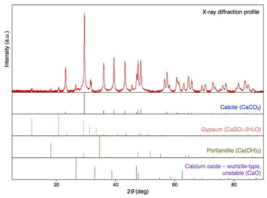 BiSCaO Water, which is a colorless and transparent disinfectant with a pH of 12.8, can be sprayed and dried on smooth metal or plastic surfaces, providing a white powder coating. Previously, SEM observation for the dried powder obtained from BiSCaO Water showed the presence of agglomerated microparticles (1–2 μm) [29]. In addition, cryo-SEM observation has indicated that aggregates (400–800 nm in size) of nanoparticles (100–200 nm) were contained in BiSCaO Water [29]. In the present work, elemental mapping of particles from BiSCaO Water revealed that the particles in the cloudy, air-exposed reagent, and the dried powder were composed of oxygen, carbon, and calcium (Figure 1). The dried white powder obtained from BiSCaO Water was insoluble in water, and the pH of the resulting supernatant was less than 10. Furthermore, X-ray diffraction analysis confirmed that the dried powder recovered from BiSCaO Water consisted primarily of CaCO3 (Figure 2).