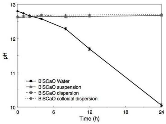 When BiSCaO Water was exposed to air with stirring for 1 h, the liquid became cloudy. Furthermore, the pH decreased to 11.7 and 10.1 after 12 and 24 h, respectively, as shown in Figure 3. Following drying, the resulting white powder was insoluble; the supernatant of a suspension of this white powder had a pH of 9.6. On the other hand, the pH of a BiSCaO suspension (0.2 wt.% BiSCaO) [18,19,24], dispersion (0.2 wt.% BiSCaO + 0.12 wt.% Na2HPO4) [27], and colloidal dispersion (0.2 wt.% BiSCaO + 0.15 wt.% PP) [28] did not change during 24 h of stirring in open air. These results suggest that the insoluble powder was CaCO3 generated by an interaction between Ca2+ ions in BiSCaO Water and CO2 in the air, and that the BiSCaO suspension, dispersion, and colloidal dispersion contained insoluble CaO and/or Ca(OH)2 in the form of micro-/nano-particles or precipitates that provide hydroxyl ions (OH–) to maintain the alkaline pH.