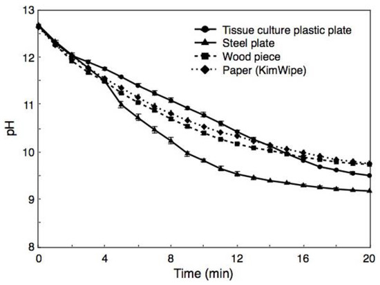 BiSCaO Water was sprayed onto the surfaces of a plastic plate, a steel plate, a piece of wood, and tissue paper (KimWipe), and the pH of each wet surface was measured over the course of the next 20 min (Figure 4). For all tested surfaces, the pH immediately after spraying was 12.6 ± 0.02, a value that was lower than the original pH of BiSCaO Water (i.e., pH 12.8). The pH of the surfaces fell below 12 after 3 min, and continued falling to less than pH 11 and 10 after 10 and 17 min, respectively.