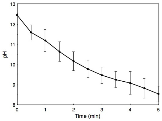 In a parallel experiment, BiSCaO Water (~1 mL) was sprayed onto the back skin of hairless rat, which then were rubbed lightly, and the pH of each wet skin was measured over the course of the following 5 min (Figure 5). The pH of the wet skin immediately after spraying was 12.4 ± 0.02, a value that was lower than the original pH of BiSCaO Water (i.e., pH 12.8). The pHs on the backs subsequently fell to pH 11.5 after 1 min, pH 9.5 after 3 min, and pH 8.5 after 5 min. We confirmed that none of the skin exhibited chapping or inflammation from use of BiSCaO Water.