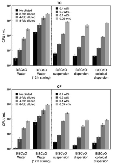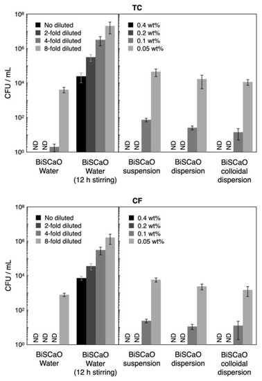 Fold diluted BiSCaO Water and 0.4 and 0.2 wt.% of BiSCaO suspension, dispersion, and colloidal dispersion showed disinfectant activities, but some TC and CF remained viable. Plating and counting were performed as a set of four technical replicates (n = 4) and error bars represent means ± S.D.