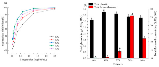 α-Glucosidase inhibition (a), total phenolic and total flavonoid content (b), of Ceratophyllum demersum L. (CDL) extracts prepared with different concentrations of methanol aqueous solvent.