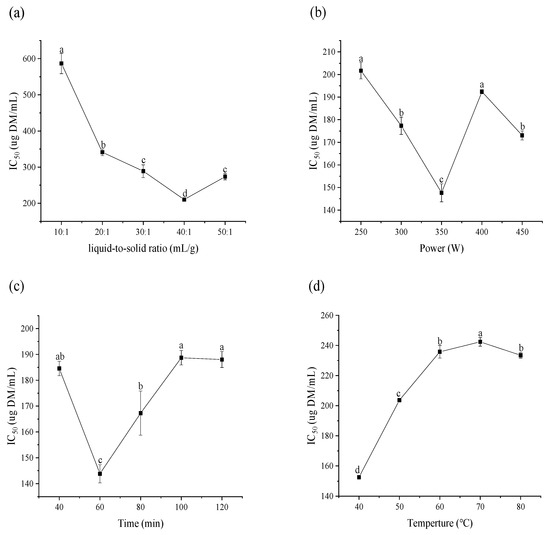 Effects of liquid-to-solid ratio (a), ultrasonic power (b), extraction time (c), extraction temperature (d), on the α-glucosidase inhibitory ability (IC50) of CDL extracts.