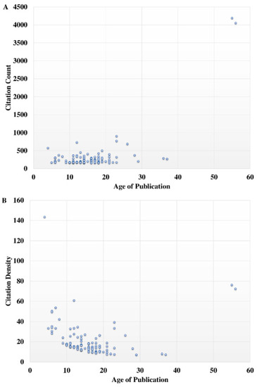 According to the Shapiro–Wilk test, the distribution of data regarding citation count, citation density, and article age were not normal (p < 0.001). A non-significant trend towards a higher citation count with article age was observed (r = 0.009, p = 0.868) (Figure 1). However, a significant negative trend towards an increased citation density with the age of publication was observed (r = −0.440, p < 0.001) (Figure 1).