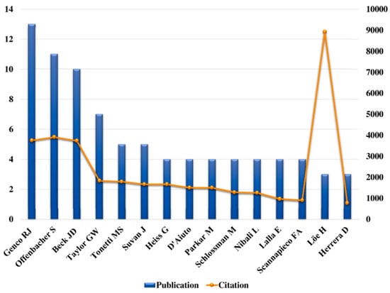 Many articles (n = 76) had between one and six authors, but publications with more than six authors were the most common (n = 24). The majority of the contributions were made by Genco (n = 13, 3750 citations), followed by Beck (n = 10, 3735), Offenbacher (n = 11, 3910), Taylor (n = 7, 1831), Tonetti (n = 5, 1793), and Suvan (n = 5, 1664) (Figure 3).