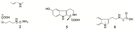 Compound 5 was obtained as a brown powder. The molecular formula was established as C12H14N2O3 by high-resolution electrospray ionization mass spectroscopy, which gave ions at m/z 467.19261 [2M-H]− (C24H27N4O6, calculated 467.19361). The IR bands of 5 were shown at 3424, 1631 and 1457 cm−1 for N-H, C=O and aromatic ring, respectively. The UV spectrum showed maximal absorptions of an indole chromophore (222 and 276 nm). In the 1H-NMR [DMSO-d6:D2O (10:3), 600 MHz, δH] spectrum of 5, signals at 7.15 (d, J = 8.6 Hz, 1H, H-7), 7.08 (s, 1H, H-2), 6.84 (d, J = 2.1 Hz, 1H, H-4), and 6.60 (dd, J = 8.6, 2.2 Hz,1H,H-6) indicated a typical 3,5-disubstituted indole moiety. Combined with two methylene signals at 3.07 (t, J = 7.2 Hz, 2H, H-11) and 2.91 (t, J = 7.2 Hz, 2H, H-10), it was suggested that 5 is a derivative of serotonin. The 13C-NMR [DMSO-d6:D2O (10:3), 150 MHz, δC] spectrum showed twelve carbon signals. Ten of them at 124.6 (C-2), 109.3 (C-3), 103.0 (C-4), 150.8 (C-5), 112.5 (C-6), 113.0 (C-7), 131.7 (C-8), 128.3 (C-9), 22.6 (C-10), and 47.8 (C-11) were assigned to serotonin skeleton by comparing with the NMR data of serotonin [7]. The 1H-NMR showed one methylene signal at δH 3.30 (s, 2H, H-13) which corresponded to 50.1 (C-13) in HSQC spectrum. Combining with the HMBC correlations between 3.30 (s, 2H, H-13) and 169.1 (C-14), disclosed the presence of one carboxymethyl group, which was attached to the serotonin skeleton at N-2 due to the HMBC correlations between 3.07 (t, J = 7.2Hz, 2H, H-11) and 50.1 (C-13), and between 3.30 (s, 2H, H-13) and 47.8 (C-11) (Figure 2). Therefore, 5 was clearly assigned to 2-(5-hydroxy-1H-indol-3-yl)ethyl)glycine, named N-carboxymethyl serotonin. It was a new natural product.