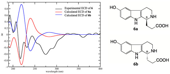 Experimental CD spectrum of 6 in H2O and the calculated ECD spectra of (1S)-6 (6a) and (1R)-6 (6b).